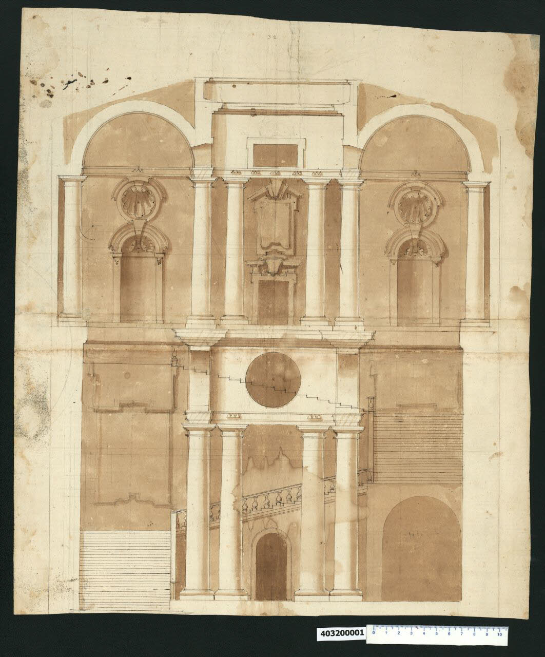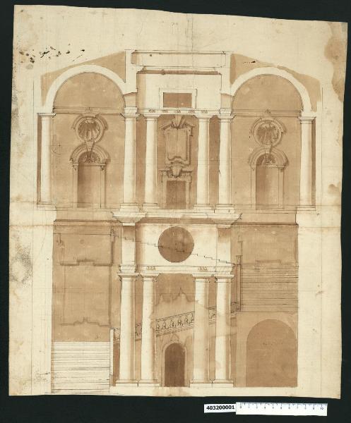 - NOTIZIE STORICO CRITICHE Nell'"Indice" del tomo nel quale era rilegato, il disegno viene definito: "Scala ornata". Il disegno mostra tra le sezioni delle ali laterali l'alzato di un palazzo prospiciente una piccola corte. Il prospetto si sviluppa su due piani, porticato quello terreno e loggiato quello superiore, ed è suddiviso in tre campate, di cui quella centrale definita da due coppie di colonne doriche che reggono un'alta trabeazione forata da un oculo al piano terra e da una finestra rettangolare al primo piano. Sembra che oggetto di studio sia lo scalone monumentale che parte alla sinistra del portico e raggiunge il primo piano con quattro rampe. Il disegno intende mostrare lo scalone collocato alle spalle del colonnato.