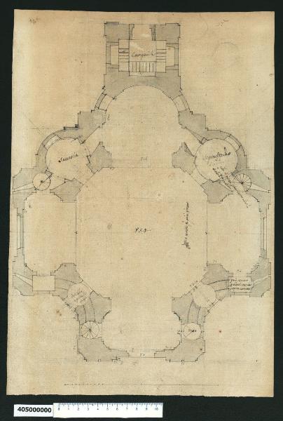 - NOTIZIE STORICO CRITICHE Nell'"Indice" del tomo nel quale era rilegato il disegno viene definito: "Altra Pianta di Chiesa".\nSi tratta di un altro progetto di chiesa a pianta centrale, una tipologia molto apprezzata dall'autore Domenico Martinelli, di cui però non si conosce nulla. L'attribuzione, confermata dall'analisi grafologica, è avanzata da Hellmut Lorenz, che riscontra analogie con una "chiesola" per il principe Liechtenstein (Lorenz 1991, p. 262 fig. 295) e con uno schema di chiesa per Cracovia (Lorenz 1991, p. 185 fig. 165). \nLa chiesa è a pianta centrale, impostata su un ottagono irregolare, in quanto i lati obliqui sono più corti. Lungo gli assi si aprono l'atrio d'ingresso e le due cappelle laterali, di forma ovoidale, mentre l'abside sul fondo ha una forma semicircolare allungata, celata esternamente dalla torre quadrata del campanile retrostante. La disposizione del campanile dietro l'abside si ritrova in un altro disegno di Martinelli presente nello stesso tomo (Milano, Collezione Sardini Martinelli inv. 4,47 bis). Ai lati dell'abside, in corrispondenza dei lati obliqui dell'ottagono centrale, si trovano le due sagrestie di forma circolare mantenuta anche all'esterno. Gli altri elementi circolari - due piccoli vestiboli collocati sugli altri due lati obliqui dell'ottagono centrale e i vani delle scale a lumaca di servizio - sono inglobati nelle spesse murature della chiesa. Il profilo esterno della chiesa ha quindi la forma di una croce greca con due spigoli interni concavi e due convessi.