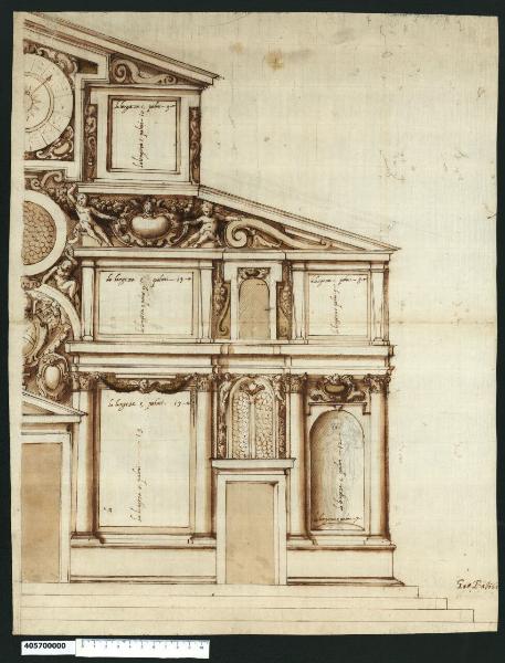 - NOTIZIE STORICO CRITICHE Nell'"Indice" del tomo nel quale era rilegato, il disegno viene definito: "Facciata di Chiesa".\nIl disegno autografo di G. B. Montano mostra la metà destra della facciata di una chiesa che non è stato possibile identificare. Il prospetto si imposta sopra una scalinata ed è articolato in due livelli. Quello inferiore ospita al centro il portale principale sormontato da un timpano triangolare; lateralmente la parete è divisa in tre campate da un ordine di colonne corinzie poste sopra uno zoccolo continuo. Il primo intercolumnio, più ampio, inquadra un settore di parete privo di decorazione, mentre nelle altre due campate, più strette, si aprono una porta secondaria con soprastante bifora, e una nicchia sormontata da un cartiglio. Le colonne reggono una trabeazione liscia oltre la quale si imposta una fascia suddivisa in campate da lesene rastremate verso il basso. Il secondo livello della facciata si limita alla sola zona centrale, ed è raccordato al sottostante dalla falda del tetto sottolineata da una cornice modanata che si innesta alla cornice inferiore di una cartella quadrata. In asse con il portale centrale sono inseriti, dal basso verso l'alto, un grande stemma con le insegne papali, una finestra circolare, e un orologio entro una cornice sagomata. Tutta la parete di fondo della facciata è riccamente ornata da stemmi, volute, ghirlande e putti.