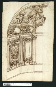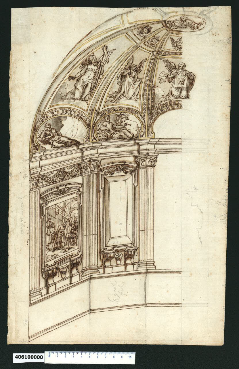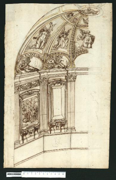 - NOTIZIE STORICO CRITICHE Nell'"Indice" del tomo nel quale era rilegato il disegno viene definito: "Spaccato di Cappella".\nGli unici elementi che accompagnano il disegno, ossia alcune iscrizioni con quote e uno schizzo a grafite, risultano insufficienti per consentire ipotesi sull'autore del progetto. Si tratta comunque di un progetto realizzato in ambito italiano, probabilmente nell'area centrale, intorno alla fine del Cinquecento.\nL'ambiente è una cappella a pianta poligonale che presenta un alto basamento liscio appena marcato agli estremi da uno zoccolino e una cornicetta sagomata. Agli spigoli del poligono sono impostate delle paraste scanalate con capitello, inframmezzate da campiture di diversa dimensione - di cui una strombata - contornate da cornici sagomate sorrette da mensoloni rovesci a voluta. Tra questi degli stemmi che sembrano raffigurare la croce dell'ordine dei Templari. Sulle cornici delle campiture poggiano frontoni curvilinei con cherubino centrale. Sopra la trabeazione rinforzata negli spigoli, si erge la cupola a spicchi, le cui campiture - un ovale e due spicchi a vela, sono sottolineate da cornici dorate e decorazioni.\nL'iconografia richiama i temi della passione di Cristo: dalla flagellazione, nel riquadro sottostante, agli angeli con la croce, il sudario e il telo col volto del Signore. La figura di Dio si staglia, oltre una serie di cherubini, dall'oculo centrale della volta. Negli ovali figure di anziani distese.