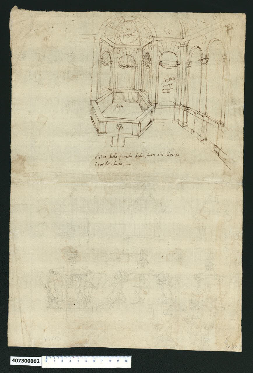 - NOTIZIE STORICO CRITICHE Nell'"Indice" del tomo nel quale era rilegato, il disegno viene definito: "Pianta ed elevazione d'un prospetto di fontana o lavatoio".\nSi tratta della veduta prospettica della "fonte" raffigurata in pianta sul recto del presente disegno. La vasca esagonale è protetta su tre lati da un parapetto continuo, mentre gli altri tre sono delimitati da una parete scavata da nicchie con calotta a conchiglia; il tutto è coperto da una pergola. Ai lati della vasca è raffigurata una porzione della parete che delimita l'intero complesso disegnato sul recto, dove un parapetto continuo funge da basamento per le colonne che reggono archi a tutto sesto. In corrispondenza del vertice dell'esagono, le colonne sono sostituite da lesene a libro che delimitano la campata entro la quale è collocata una nicchia.\nNella metà inferiore del foglio sono tracciati a grafite gruppi scultorei che reggono tabernacoli.