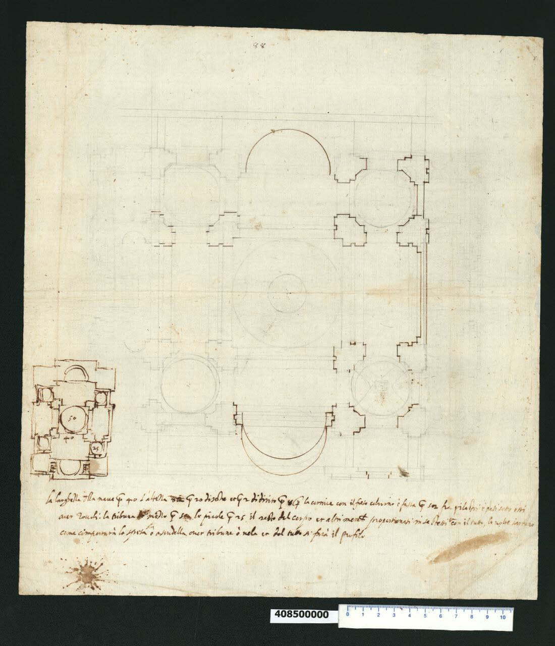 - NOTIZIE STORICO CRITICHE Nell'"Indice" del tomo nel quale era rilegato, il disegno viene definito: "Schizzo d'una pianta di Chiesa". Il disegno relativo alla chiesa dello Spirito Santo dei Napoletani in fase di progettazione nel 1584, raffigura due soluzioni appena abbozzate di organismi simili tra loro: a schema rigorosamente centrale quello geometrico e più completo, allungato lungo l'asse longitudinale quello più piccolo sul margine sinistro e tracciato a mano libera. Il progetto a pianta centrale con cinque cupole e due absidi contrapposte trova i suoi precedenti nei progetti bramanteschi per S. Pietro, SS. Celso e Giuliano di Bramante (Salerno, Spezzaferro, Tafuri 1973, p. 394). Un'altra soluzione per la chiesa dei Napoletani di Mascherino è riprodotta nella copia di Domenico Martinelli in Milano, Collezione Sardini Martinelli inv. 4,40.