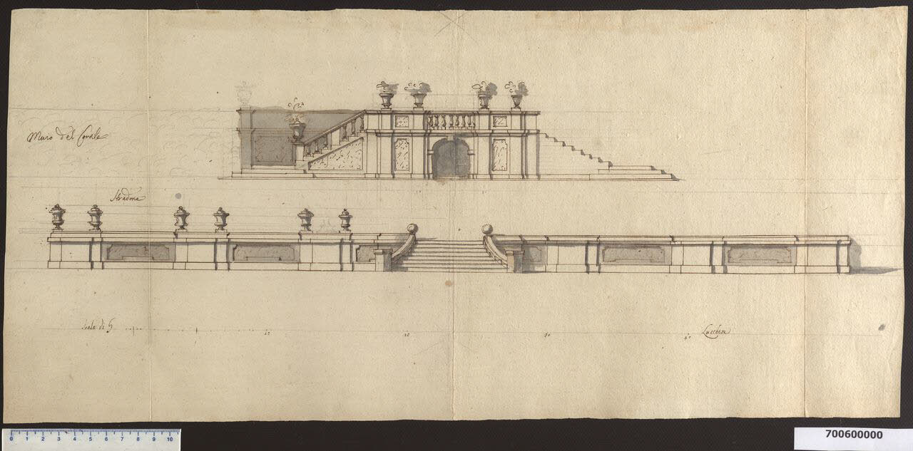 - NOTIZIE STORICO CRITICHE Nell'"Indice de Disegni" del tomo nel quale era rilegato il disegno viene definito: "Prospetto di Scala".\nL'indice di Sardini non è molto esplicativo riguardo ai disegni raccolti in questo settimo tomo della Collezione Sardini Martinelli e il disegno non fornisce indicazioni per una sua certa identificazione.\nDalla scala grafica in braccia lucchesi si può dedurre che fosse pensato per il giardino di una delle tante ville della zona e riguardo all'autore del progetto e del disegno, potrebbe trattarsi di Domenico Martinelli, che al suo ritorno a Lucca nel 1716 - come afferma il biografo Giovanni Battista Franceschini in "Memorie della vita di Domenico Martinelli" del 1772 - benché malato, sembra avesse prodotto numerosi disegni per i suoi concittadini (Lorenz 1991, p. 141). \nLa grafia delle iscrizioni e del disegno sembrerebbero appartenere all'architetto lucchese.\nIl disegno rappresenta due prospetti di scalinate. La prima, prospettante su strada (come indicato da un'iscrizione) e affiancata dal muro del cortile, è in realtà una doppia scalinata ben definita sul lato sinistro e abbozzata sul destro, che si sviluppa dopo i primi tre gradini frontali parallelamente al muro di cinta, dietro una balaustra con colonnine e campiture piene riquadrate, decorata con vasi di arbusti. La struttura sottostante è costituita da: una campitura bocciardata trapezoidale che segue l'inclinazione della rampa, due pilastrini accoppiati, una campitura con riquadratura sagomata bocciardata, un ulteriore pilastrino e un'apertura centrale ad arco con conci d'imposta e chiave di volta in pietra; lo schema è ripetuto simmetricamente per l'altra rampa.\nLa seconda scalinata, forse riferita a una parte interna al giardino, è frontale e svasata verso il basso, centrata in un'alta zoccolatura che presenta un'alternanza di parti piene con aggetti e tratti rientranti con riquadrature sagomate incassate dalla finitura bocciardata. Sulla soglia della zoccolatura è appoggiata una serie di vasi coperti.