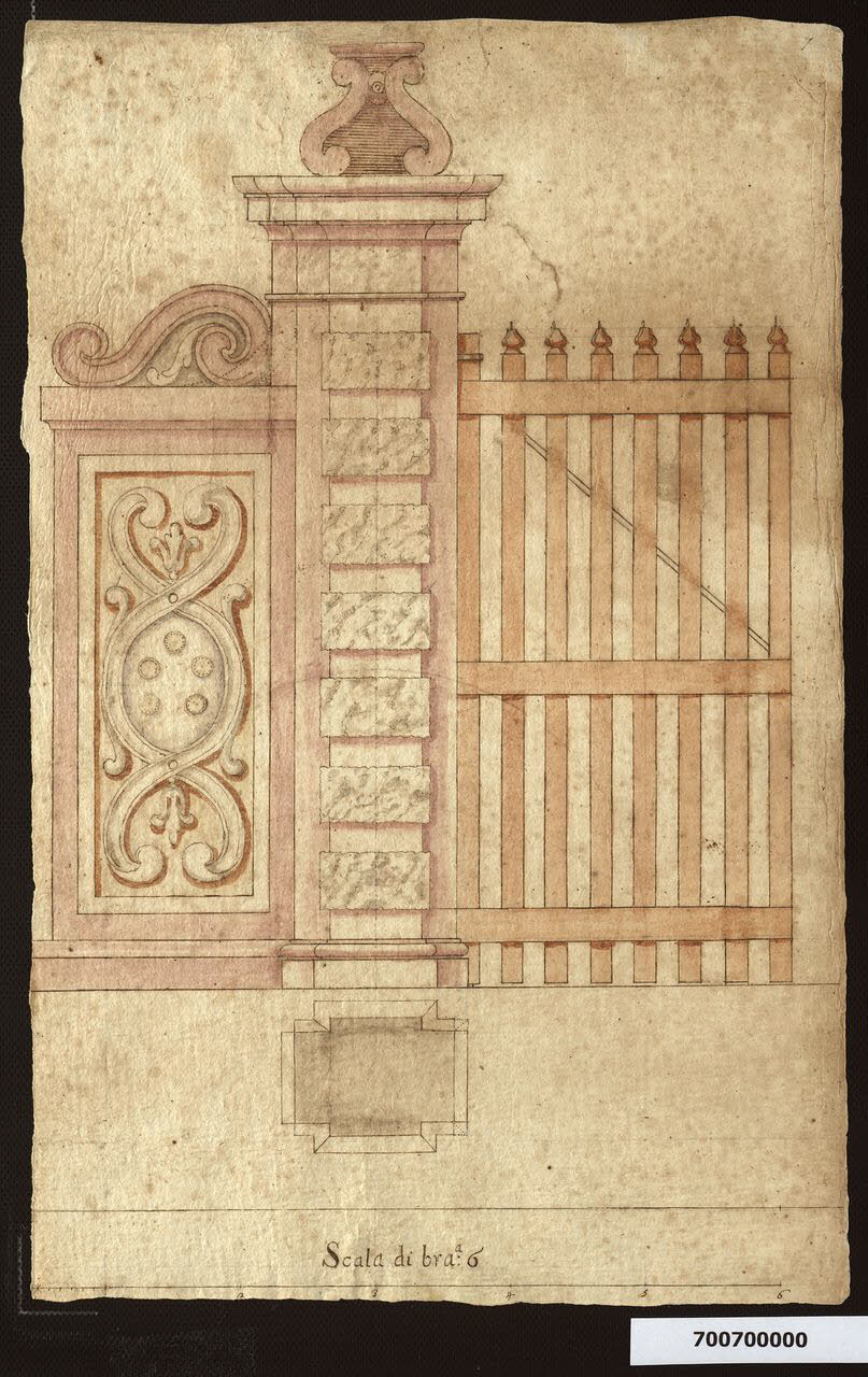- NOTIZIE STORICO CRITICHE Nell'"Indice de Disegni" del tomo nel quale era rilegato il disegno viene definito: "d.° di catro".\nL'indice di Sardini non è molto esplicativo riguardo ai disegni raccolti in questo settimo tomo della Collezione Sardini Martinelli. Si suppone che il disegno sia stato realizzato in ambito lucchese essendo la scala grafica espressa in "braccia" come in altri disegni del tomo, anche se in questo caso non si specifica che si tratta di "braccia lucchesi". Riguardo all'autore non vi sono indicazioni sufficienti per una sua certa identificazione.\nSi tratta del prospetto di un cancello dai battenti in liste di legno unite da tre fasce trasversali, di cui il disegno rappresenta solo il sinistro, incardinato a un pilastrino a croce decorato frontalmente con fasce in pietra bugnate, alla cui sommità è appoggiato un piedistallo con volute per vasi.\nAlla sinistra del pilastrino è raffigurato anche un tratto del muro di cinta, in cui è incastonato un pannello decorativo con bassorilievo in pietra raffigurante un motivo di nastri intrecciati che formano un ovale centrale e terminano da entrambe le parti in due riccioli che racchiudono un giglio. Il muro è sormontato da una voluta scolpita in pietra.\nSi ritiene che il disegno sia stato eseguito intorno alla fine del XVII secolo.