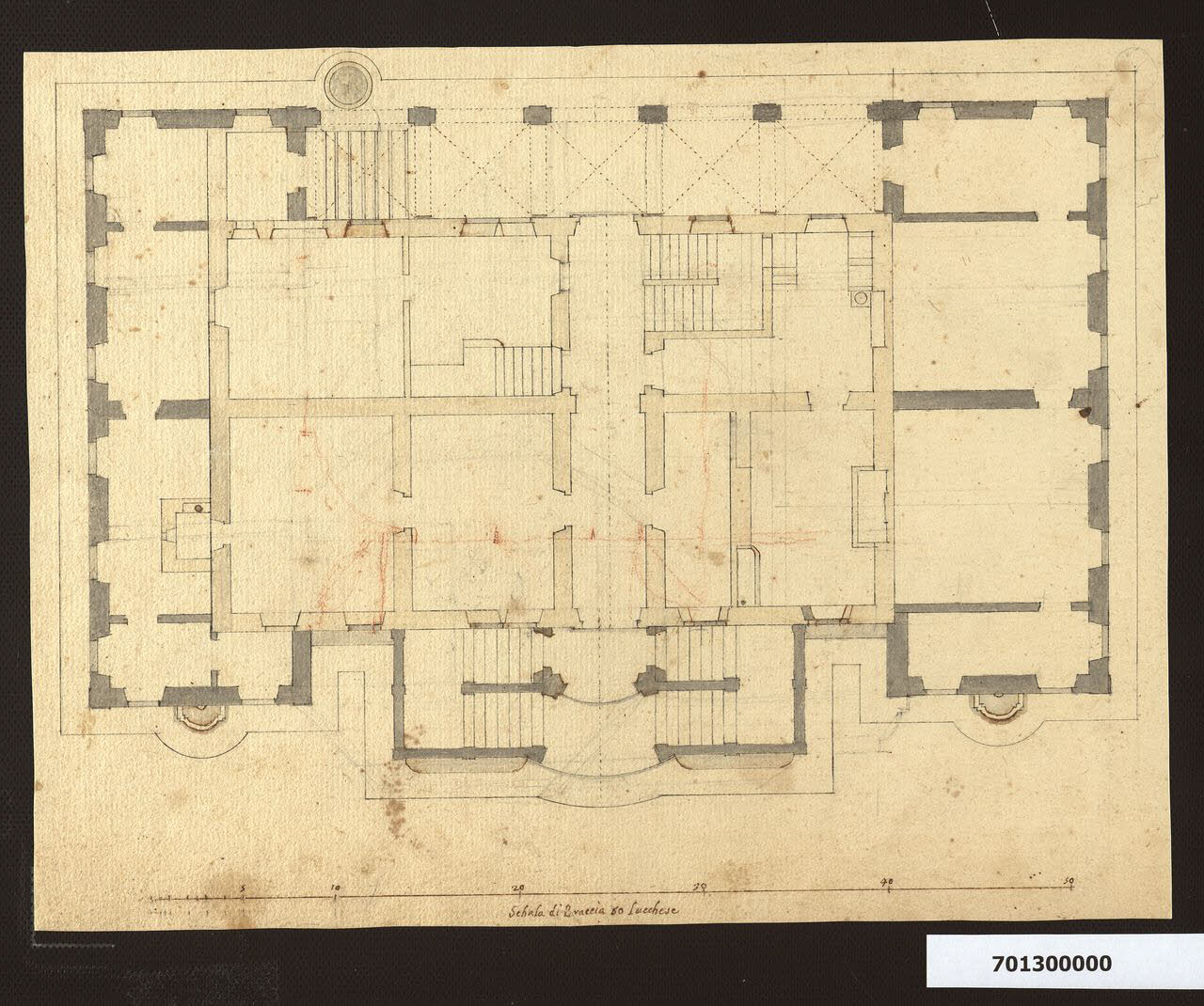 - NOTIZIE STORICO CRITICHE Nell'"Indice de Disegni" del tomo nel quale il marchese Giacomo Sardini lo aveva rilegato, insieme ad altre piante del gruppo, il disegno viene definito: "Diverse piante per riattare l'antica villa di Casa Sardini alla P. S. Stefano, con l'idea di lasciare le mura vecchie che poi non si giudicò possibile tenerle in piedi".\nSi tratta di un'ipotesi progettuale che aveva preceduto quella che, a partire dal 1774, aveva portato il marchese alla riedificazione della villa a Pieve Santo Stefano in forme neo palladiane (disegni conservati in Milano, Collezione Sardini Martinelli inv. 9,47; 9,79; 9,126; 9,54; 9,96; 9,67. Sulla villa si veda da ultimo P. Bertoncini Sabatini, Il palazzo lucchese di Giacomo Sardini (1780-1811): un "intendente" di architettura tra Illuminismo e Romanticismo, in Le dimore di Lucca, Firenze 2007; l'autore non aveva avuto modo di esaminare i fogli citati, in quanto esclusi dalla consultazione per motivi di conservazione). Preesisteva in loco un edificio per il quale il padre di Sardini, assente da Lucca, aveva affidato al fratello Lodovico, tutore dei figli, il compito della "restaurazione della casa" (Archivio di Stato di Lucca, Archivio Sardini =AS, n. 98, cc. 46, 158). Egli si era attivato particolarmente dopo la morte del fratello, avvenuta nel 1761, poiché più tardi Giacomo, nel descrivere un momento denso di preoccupazioni finanziarie, annoterà: "erami impegnato in una casa di campagna, che mio zio e tutore mi aveva costretto ad intraprendere per la quantità di fabbriche accessorie, che aveva egli preparato" (AS, n. 128 Memorie ... M. Teresa Sardini, c. 5). In un altro scritto, composto una volta ultimata la villa secondo il progetto definitivo, Sardini ribadiva il coinvolgimento dello zio in una precedente ristrutturazione: "L'ala verso mezzogiorno fu costruita sopra un vecchio fondamento, che mio zio aveva fatto fabbricare con un'altra idea e non ha dato alcun movimento..." (AS, N. 129 Memorie della famiglia Sardini, pp. 58-61). Alle ambizioni che Lodovico Sardini poteva aver espresso tra il 1761 e il 1769, anno della conclusione dell'iter formativo romano di Giacomo, è plausibile accostare un gruppo di disegni della Collezione Sardini Martinelli attribuiti a Giovan Francesco Giusti (inv. 7,13; 7,16; 7,17; 7,18; 7,18bis; 7,19; 7,20): i progetti, eseguiti entro la fine degli anni Sessanta, andrebbero datati a partire dal 1757, anno della prima lettera che testimonia l'affidamento della ristrutturazione a Lodovico (Bertoncini Sabatini 2019). Sabatini (1993) li aveva precedentemente letti come primo progetto della villa risalente alla committenza di Giacomo, attribuendoli alla mano dello stesso. Tuttavia il confronto con altri disegni sicuramente eseguiti da Sardini ha portato ad escludere la sua paternità per questo gruppo che, pur presentando qualche incertezza nel ductus, palesa una padronanza del mezzo grafico più convincente di quella dimostrata dal nobile dilettante di architettura. L'analisi congiunta di tali elaborati con gli altri incentrati sulla fabbrica di Pieve Santo Stefano e presenti nella Collezione rivela come essi abbiano costituito, prima di por mano alla sostanziale riedificazione della villa, la base fornita dal marchese a disegnatori di sua fiducia per immaginare un casino di caccia su due livelli con stanze per gli ospiti (ibidem inv. 9,76; 9,26; 9,31 e prima 7,14; 7,15 e ms 9,108ter). Nel disegno in esame, che si ritiene risalente alla committenza di Lodovico, è delineato il rilievo in pianta dello stato di fatto del piano terreno e la messa a punto del progetto, attraverso il quale le modeste strutture murarie esistenti sono inglobate in un edificio più ampio di pianta quadrangolare con ali aggettanti sulla facciata lunga che ripartiscono il prospetto in tre porzioni. La parte centrale del prospetto principale appare nobilitata da uno scalone a doppie rampe contrapposte, quella della facciata posteriore scandita da un porticato. L'accesso delle carrozze, a guisa di corridoio, attraversa l'edificio nell'asse mediano al piano terreno. Sulla distribuzione degli ambienti interni si sono in seguito stratificati schizzi poco decifrabili ma indicativi di incertezze da parte della committenza. Come si evince dal prospetto principale (ibidem inv. 7,20), la struttura avrebbe avuto due piani e un mezzanino sotto le coperture. \nSe lo scalone riprende una tipologia consolidata nell'architettura lucchese (basti pensare al palazzo Cittadella e all'Offizio della Foce a Viareggio, a pochi passi da una delle dimore dei Sardini), l'accento di estroflessione conferitogli sembra prefigurare l'invenzione di Ottaviano Diodati per il balcone del piano nobile di palazzo Tucci a Lucca (sulla stessa via di palazzo Sardini).