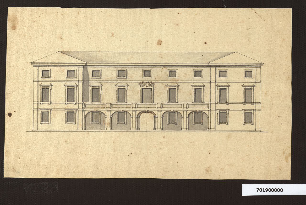 - NOTIZIE STORICO CRITICHE Nell'"Indice de Disegni" del tomo nel quale era rilegato il disegno, insieme agli altri prospetti del gruppo, viene definito: "Elevazioni diverse relative alle stesse piante" (il rimando è alle "piante per riattare l'antica villa di Casa Sardini alla P. S. Stefano").\nSi tratta di un'ipotesi progettuale che aveva preceduto quella che, a partire dal 1774, aveva portato il marchese alla riedificazione della villa a Pieve Santo Stefano in forme neo palladiane (disegni conservati in Milano, Collezione Sardini Martinelli inv. 9,47; 9,79; 9,126; 9,54; 9,96; 9,67. Sulla villa si veda da ultimo P. Bertoncini Sabatini, Il palazzo lucchese di Giacomo Sardini (1780-1811): un "intendente" di architettura tra Illuminismo e Romanticismo, in Le dimore di Lucca, Firenze 2007; l'autore non aveva avuto modo di esaminare i fogli citati, in quanto esclusi dalla consultazione per motivi di conservazione). Preesisteva in loco un edificio per il quale il padre di Sardini, assente da Lucca, aveva affidato al fratello Lodovico, tutore dei figli, il compito della "restaurazione della casa" (Archivio di Stato di Lucca, Archivio Sardini =AS, n. 98, cc. 46, 158). Egli si era attivato particolarmente dopo la morte del fratello, avvenuta nel 1761, poiché più tardi Giacomo, nel descrivere un momento denso di preoccupazioni finanziarie, annoterà: "erami impegnato in una casa di campagna, che mio zio e tutore mi aveva costretto ad intraprendere per la quantità di fabbriche accessorie, che aveva egli preparato" (AS, n. 128 Memorie ... M. Teresa Sardini, c. 5). In un altro scritto, composto una volta ultimata la villa secondo il progetto definitivo, Sardini ribadiva il coinvolgimento dello zio in una precedente ristrutturazione: "L'ala verso mezzogiorno fu costruita sopra un vecchio fondamento, che mio zio aveva fatto fabbricare con un'altra idea e non ha dato alcun movimento..." (AS, N. 129 Memorie della famiglia Sardini, pp. 58-61). Alle ambizioni che Lodovico Sardini poteva aver espresso tra il 1761 e il 1769, anno della conclusione dell'iter formativo romano di Giacomo, è plausibile accostare un gruppo di disegni della Collezione Sardini Martinelli attribuiti a Giovan Francesco Giusti (inv. 7,13; 7,16; 7,17; 7,18; 7,18bis; 7,19; 7,20): i progetti, eseguiti entro la fine degli anni Sessanta, andrebbero datati a partire dal 1757, anno della prima lettera che testimonia l'affidamento della ristrutturazione a Lodovico (Bertoncini Sabatini 2019). Sabatini (1993) li aveva precedentemente letti come primo progetto della villa risalente alla committenza di Giacomo, attribuendoli alla mano dello stesso. Tuttavia il confronto con altri disegni sicuramente eseguiti da Sardini e conservati nella stessa Collezione ha portato ad escludere la sua paternità per questo gruppo che, pur presentando qualche incertezza nel ductus, palesa una padronanza del mezzo grafico più convincente di quella dimostrata dal nobile dilettante di architettura. L'analisi congiunta di tali elaborati con gli altri incentrati sulla fabbrica di Pieve Santo Stefano e presenti nella Collezione rivela come essi abbiano costituito, prima di por mano alla sostanziale riedificazione della villa, la base fornita dal marchese a disegnatori di sua fiducia per immaginare un casino di caccia su due livelli con stanze per gli ospiti (ibidem inv. 9,76; 9,26; 9,31 e prima 7,14; 7,15 e ms 9,108ter). Nel progetto in esame, che si ritiene risalente alla committenza di Lodovico, le modeste strutture murarie esistenti venivano inglobate in un edificio più ampio di pianta quadrangolare con ali aggettanti sulla facciata lunga che ripartivano il prospetto in tre porzioni (vedi planimetrie inv. 7,13; 7,17). La parte centrale del prospetto principale era nobilitata da uno scalone a doppie rampe contrapposte (vedi inv. 7,20), quella della facciata posteriore, delineata nel presente foglio, era scandita da un porticato coronato da una lunga terrazza. L'accesso delle carrozze, a guisa di corridoio, attraversava l'edificio nell'asse mediano al piano terreno. La struttura consisteva di due piani e di un mezzanino sotto le coperture.\nLa tipologia delle aperture del piano nobile, che tornerà poi nel palazzo Sardini di città, rivela una riflessione sulle invenzioni di Domenico Martinelli per le finestre del castello di Austerlitz, forse maturata attraverso lo studio dei disegni presenti a Lucca.