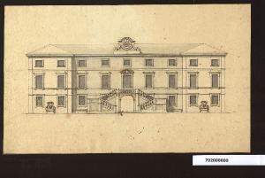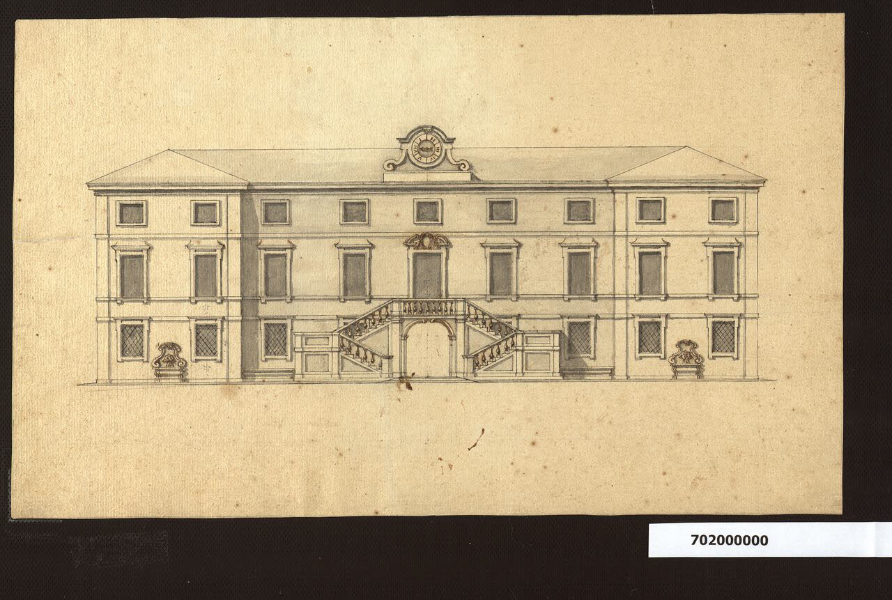 - NOTIZIE STORICO CRITICHE Nell'"Indice de Disegni" del tomo nel quale era rilegato il disegno, insieme agli altri prospetti del gruppo, viene definito: "Elevazioni diverse relative alle stesse piante" (il rimando è alle "piante per riattare l'antica villa di Casa Sardini alla P. S. Stefano").\nSi tratta di un'ipotesi progettuale che aveva preceduto quella che, a partire dal 1774, aveva portato il marchese alla riedificazione della villa a Pieve Santo Stefano in forme neo palladiane (disegni conservati in Milano, Collezione Sardini Martinelli inv. 9,47; 9,79; 9,126; 9,54; 9,96; 9,67. Sulla villa si veda da ultimo P. Bertoncini Sabatini, Il palazzo lucchese di Giacomo Sardini (1780-1811): un "intendente" di architettura tra Illuminismo e Romanticismo, in Le dimore di Lucca, Firenze 2007; l'autore non aveva avuto modo di esaminare i fogli citati, in quanto esclusi dalla consultazione per motivi di conservazione). Preesisteva in loco un edificio per il quale il padre di Sardini, assente da Lucca, aveva affidato al fratello Lodovico, tutore dei figli, il compito della "restaurazione della casa" (Archivio di Stato di Lucca, Archivio Sardini =AS, n. 98, cc. 46, 158). Egli si era attivato particolarmente dopo la morte del fratello, avvenuta nel 1761, poiché più tardi Giacomo, nel descrivere un momento denso di preoccupazioni finanziarie, annoterà: "erami impegnato in una casa di campagna, che mio zio e tutore mi aveva costretto ad intraprendere per la quantità di fabbriche accessorie, che aveva egli preparato" (AS, n. 128 Memorie ... M. Teresa Sardini, c. 5). In un altro scritto, composto una volta ultimata la villa secondo il progetto definitivo, Sardini ribadiva il coinvolgimento dello zio in una precedente ristrutturazione: "L'ala verso mezzogiorno fu costruita sopra un vecchio fondamento, che mio zio aveva fatto fabbricare con un'altra idea e non ha dato alcun movimento..." (AS, N. 129 Memorie della famiglia Sardini, pp. 58-61). Alle ambizioni che Lodovico Sardini poteva aver espresso tra il 1761 e il 1769, anno della conclusione dell'iter formativo romano di Giacomo, è plausibile accostare un gruppo di disegni della Collezione Sardini Martinelli attribuiti a Giovan Francesco Giusti (inv. 7,13; 7,16; 7,17; 7,18; 7,18bis; 7,19; 7,20): i progetti, eseguiti entro la fine degli anni Sessanta, andrebbero datati a partire dal 1757, anno della prima lettera che testimonia l'affidamento della ristrutturazione a Lodovico (Bertoncini Sabatini 2019). Sabatini (1993) li aveva precedentemente letti come primo progetto della villa risalente alla committenza di Giacomo, attribuendoli alla mano dello stesso. Tuttavia il confronto con altri disegni sicuramente eseguiti da Sardini ha portato ad escludere la sua paternità per questo gruppo che, pur presentando qualche incertezza nel ductus, palesa una padronanza del mezzo grafico più convincente di quella dimostrata dal nobile dilettante di architettura. L'analisi congiunta di tali elaborati con gli altri incentrati sulla fabbrica di Pieve Santo Stefano e presenti nella Collezione rivela come essi abbiano costituito, prima di por mano alla sostanziale riedificazione della villa, la base fornita dal marchese a disegnatori di sua fiducia per immaginare un casino di caccia su due livelli con stanze per gli ospiti (ibidem inv. 9,76; 9,26; 9,31 e prima 7,14; 7,15 e ms 9,108ter). Nel progetto in esame, che si ritiene risalente alla committenza di Lodovico, le modeste strutture murarie esistenti venivano inglobate in un edificio più ampio di pianta quadrangolare con ali aggettanti sulla facciata lunga che ripartivano il prospetto in tre porzioni (vedi planimetrie inv. 7,13; 7,17). La parte centrale del prospetto principale, come si osserva nel presente foglio, era nobilitata da uno scalone a doppie rampe contrapposte, quella della facciata posteriore era scandita da un porticato coronato da una lunga terrazza (vedi inv. 7,19). L'accesso delle carrozze, a guisa di corridoio, attraversava l'edificio nell'asse mediano al piano terreno. La struttura consisteva di due piani e di un mezzanino sotto le coperture.\nSe lo scalone riprende una tipologia consolidata nell'architettura lucchese (basti pensare al palazzo Cittadella e all'Offizio della Foce a Viareggio, a pochi passi da una delle dimore dei Sardini), l'accento di estroflessione conferitogli e la mirata distribuzione dei balaustrini sembrano prefigurare l'invenzione di Ottaviano Diodati per il balcone del piano nobile di palazzo Tucci a Lucca (sulla stessa via di palazzo Sardini). Inoltre alcuni dettagli decorativi come l'orologio tra volute e le fontane con mascheroni, sono accostabili con soluzioni prospettate da Giovan Francesco Giusti. La tipologia delle aperture del piano nobile, che tornerà poi nel palazzo Sardini di città, rivela una riflessione sulle invenzioni di Domenico Martinelli per le finestre del castello di Austerlitz, forse maturata attraverso lo studio dei disegni presenti a Lucca.
