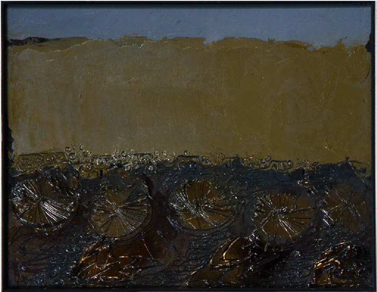 - NOTIZIE STORICO CRITICHE Non è semplice ricostruire la vicenda creativa di questa serie di opere vista la difficile identificazione del soggetto che rimane per certi versi enigmatico. Si può tuttavia ricondurlo, grazie ad alcuni schizzi, ai forni crematori ("ghats") collocati lungo le rive del Gange. Tutti i dipinti della serie sono risolti nella divisione del pannello in due fasce orizzontali: quella superiore totalmente occupata dalle spatolate piatte e uniformi che descrivono una striscia di cielo e la massa torbida del fiume, e quella inferiore giocata su incastri di indefinite pezzature circolari dai colori terrosi.