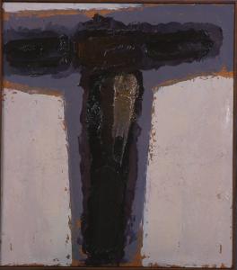 - NOTIZIE STORICO CRITICHE Scomparso ogni elemento che possa dirsi in qualche modo "paesaggistico", la figura di Cristo crocefisso torna ad accamparsi in uno spazio vuoto e non definibile. Tuttavia, qui, non si tratta di uno spazio-tenebra come era invece nel caso del Crocefisso 64: la croce si staglia su uno sfondo chiaro, quasi anodino, che al limite potrebbe essere identificato con un compatto cielo autunnale, non fosse per un alone tutt'altro che naturalistico che, in una tonalità più scura di grigio, circoscrive l'intera sagoma del soggetto. Ricompare qui il braccio orizzontale della croce, già scomparso nelle versioni precedenti; tutta la figura è dipinta a spatolate spesse e sovrapposte in un colore bruno-marrone e con una consistenza quasi bituminosa che indica la direzione dei successivi e più radicali Crocefissi 81, 90 e 91. Dipinto con un segno verticale color caffelatte, è riconoscibile il capo reclinato di Cristo, incassato e sceso al di sotto della linea delle spalle, con i capelli che ne celano il volto; un ulteriore indizio per identificarlo è la polvere d'oro che Congdon utilizza di consuetudine per questo elemento dei Crocefissi, oltre che per il sole nelle vedute e nei paesaggi.