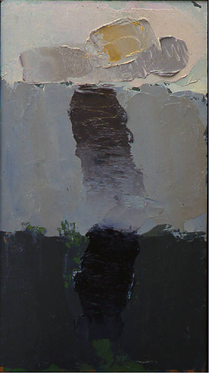 - NOTIZIE STORICO CRITICHE A questo punto della serie, l'immagine del Crocefisso ha già subito trasformazioni che costituiscono dei punti nodali nell'evoluzione di questo soggetto: il numero 46 del 1969 aveva segnato l'dentificazione fra la croce e il paesaggio; il numero 64, appena precedente il dipinto in esame, aveva coronato la tematica dei Cristo-larva nata in seguito al soggiorno a Bombay. In questo Crocefisso 66, Congdon sembra riprendere i caratteri dei Crocefissi landscape, con una struttura e una gamma cromatica che anticipano le vedute rurali e nebbiose della stagione nella Bassa milanese: lo sfondo è costituito da tre bande in gradazioni differenti di grigio; nella parte alta, la testa reclinata di Cristo, dipinta con un impasto di polvere oro, richiama i pallidi soli autunnali, mentre le spatolate brune e verticali che descrivono il corpo potrebbero essere un qualsiasi elemento della vegetazione campestre, oppure un canale. Inoltre la sfumatura di questo elemento, che si interrompe in corrispondenza della banda grigia più scura per riprendere con uno stacco netto appena sotto, crea l'effetto di un tronco d'albero che si riflette su uno specchio d'acqua.