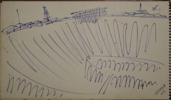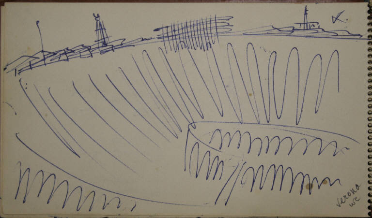 - NOTIZIE STORICO CRITICHE Congdon si è raramente dedicato al disegno come forma espressiva autonoma, così la mole di disegni raccolti sui taccuini non sono altro che appunti visivi presi durante numerosi viaggi. In questo senso non è possibile, se non raramente, assegnare al singolo disegno un'opera finita direttamente corrispondente, così questi disegni non vengono nemmeno ad essere schizzi preparatori. La sommatoria di tutti i disegni relativi a un luogo danno origine a una serie di dipinti che non hanno un corrispettivo oggettivo nei disegni stessi. Tutto questo giustifica la presenza degli appunti all'interno delle immagini (colori, sfumature e spiegazioni di vario genere). Le città marinare sono nei taccuini di Congdon uno dei soggetti più presenti, data la sua abitudine di viaggiare in nave. Congdon abbandona la laguna per un breve soggiorno nell'entroterra veneto che non lascia quasi traccia se non per una veduta "aerea" dell'arena e dei campanili che svettano sui tetti della città.