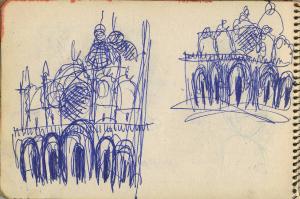 - NOTIZIE STORICO CRITICHE Congdon si è raramente dedicato al disegno come forma espressiva autonoma, così la mole di disegni raccolti sui taccuini non sono altro che appunti visivi presi durante numerosi viaggi. In questo senso non è possibile, se non raramente, assegnare al singolo disegno un'opera finita direttamente corrispondente, così questi disegni non vengono nemmeno ad essere schizzi preparatori. La sommatoria di tutti i disegni relativi a un luogo danno origine a una serie di dipinti che non hanno un corrispettivo oggettivo nei disegni stessi. Tutto questo giustifica la presenza degli appunti all'interno delle immagini (colori, sfumature e spiegazioni di vario genere). Le città marinare sono nei taccuini di Congdon uno dei soggetti più presenti, data la sua abitudine di viaggiare in nave. Qui si sofferma nella descrizione dei posti più significativi da un punto di vista storico artistico ma non disdegna i dettagli quotidiani delle folle dei turisti come dei risvolti più privati che incontra nel suo soggiorno. Conosciamo così i dettagli dell'arredo degli interni (dal bar alla stanza d'albergo). Nei disegni veneziani il tratto si fa particolarmente ricco per arrivare a descrivere tutti gli archi di piazza San Marco, il brulichio delle folle viste dall'alto a passeggio sulle rive del canal grande ecc ecc. fino alle fantasie fiorate dei vestiti delle signore ai tavolini del bar. Le stanze d'albergo, qui come in altri taccuini, non possono non riportare alla memoria gli interni di Matisse, tanto dettagliati nella ricchezza di particolari da diventare un unico lavorio di superficie.