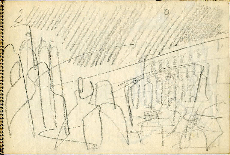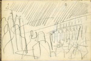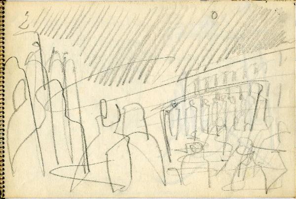 - NOTIZIE STORICO CRITICHE Congdon si è raramente dedicato al disegno come forma espressiva autonoma, così la mole di disegni raccolti sui taccuini non sono altro che appunti visivi presi durante numerosi viaggi. In questo senso non è possibile, se non raramente, assegnare al singolo disegno un'opera finita direttamente corrispondente, così questi disegni non vengono nemmeno ad essere schizzi preparatori. La sommatoria di tutti i disegni relativi a un luogo danno origine a una serie di dipinti che non hanno un corrispettivo oggettivo nei disegni stessi. Tutto questo giustifica la presenza degli appunti all'interno delle immagini (colori, sfumature e spiegazioni di vario genere). Le città marinare sono nei taccuini di Congdon uno dei soggetti più presenti, data la sua abitudine di viaggiare in nave. Qui si sofferma nella descrizione dei posti più significativi da un punto di vista storico artistico ma non disdegna i dettagli quotidiani delle folle dei turisti come dei risvolti più privati che incontra nel suo soggiorno. Conosciamo così i dettagli dell'arredo degli interni (dal bar alla stanza d'albergo). Nei disegni veneziani il tratto si fa particolarmente ricco per arrivare a descrivere tutti gli archi di piazza San Marco, il brulichio delle folle viste dall'alto a passeggio sulle rive del canal grande ecc ecc. fino alle fantasie fiorate dei vestiti delle signore ai tavolini del bar. Le stanze d'albergo, qui come in altri taccuini, non possono non riportare alla memoria gli interni di Matisse, tanto dettagliati nella ricchezza di particolari da diventare un unico lavorio di superficie.