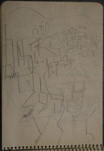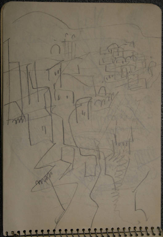 - NOTIZIE STORICO CRITICHE Congdon si è raramente dedicato al disegno come forma espressiva autonoma, così la mole di disegni raccolti sui taccuini non sono altro che appunti visivi presi durante numerosi viaggi. In questo senso non è possibile, se non raramente, assegnare al singolo disegno un'opera finita direttamente corrispondente, così questi disegni non vengono nemmeno ad essere schizzi preparatori. La sommatoria di tutti i disegni relativi a un luogo danno origine a una serie di dipinti che non hanno un corrispettivo oggettivo nei disegni stessi. Accanto alla produzione di disegni paesaggistici, soggetto quasi esclusivo nei taccuini di viaggio di Congdon, compaiono sporadicamente temi diversi. Nel viaggio a Santorini del 1955 l'artista è colpito non solo dalla grandezza naturalistica del luogo, ma anche da alcune piccolezze tipiche del villaggio, dalle casette arroccate ai pesci appena pescati. Il tutto sempre raccontato con grande economia di segni eppure con grande espressività ed esattezza.
