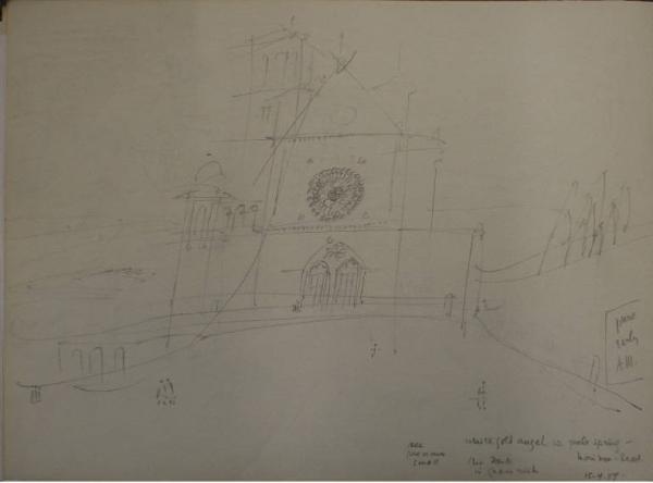- NOTIZIE STORICO CRITICHE Congdon si è raramente dedicato al disegno come forma espressiva autonoma, così la mole di disegni raccolti sui taccuini non sono altro che appunti visivi presi durante numerosi viaggi. In questo senso non è possibile, se non raramente, assegnare al singolo disegno un'opera finita direttamente corrispondente, così questi disegni non vengono nemmeno ad essere schizzi preparatori. La sommatoria di tutti i disegni relativi a un luogo danno origine a una serie di dipinti che non hanno un corrispettivo oggettivo nei disegni stessi. Tutto questo giustifica la presenza degli appunti all'interno delle immagini (colori, sfumature e spiegazioni di vario genere). Nel 1954 Congdon viaggiando per l'Italia dedica un taccuino al passaggio tra Assisi e Orvieto. Vediamo così susseguirsi disegni di architetture assisiate (San Francesco, San Rufino e Santa Chiara) insieme ai paesaggi della campagna dell'alto Lazio.