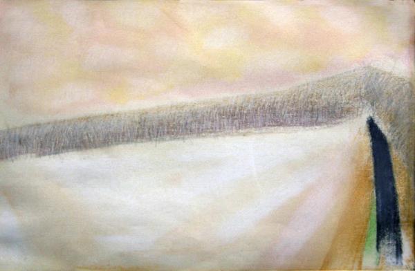 - NOTIZIE STORICO CRITICHE Congdon affianca alla produzione dei dipinti le prime opere a pastello all'inizio degli anni Ottanta. Le prime prove, come in questo caso, risentono ancora di una visione di tipo naturalistico: il paesaggio rurale, che egli osserva della finestra del suo studio alla Cascinazza come tra le montagne di Subiaco, viene restituito in maniera sintetica e allo stesso tempo estremamente narrativa. Compaiono una serie di elementi che rimangono come imprescindibili punti di riferimento: il campo che si incunea verso al linea dell'orizzonte, il filare di alberi che separa la terra dal cielo e il segno scuro del canale sulla destra che fiancheggia il campo, la montagna che chiude la vista della valle dell'Aniene.
