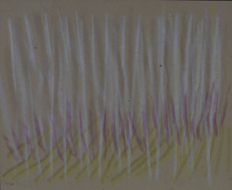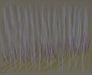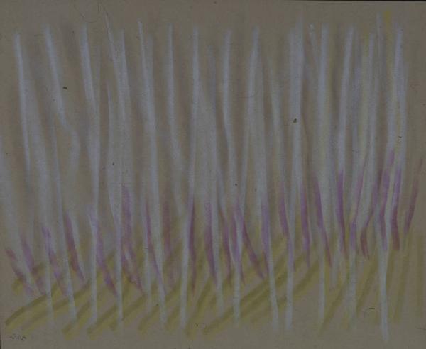 - NOTIZIE STORICO CRITICHE Altra variante del paesaggio è data da una serie di pastelli in cui l'immagine viene descritta mediante una cortina di segni paralleli o quasi, organizzati di volta in volta secondo un'economia differente: ora i segni si fanno più radi e lasciano spazio al fondo e al suo colore, che diventa un elemento più evidentemente costitutivo dell'immagine, ora i segni si fanno più fitti, fino quasi a nascondere il fondo lasciandone intravedere solo alcune linee sottili. C'è anche una differenza ritmica all'interno dell'utilizzo dei segni stessi: una più rigorosa data dall'utilizzo esclusivo di linee parallele, l'altra invece più "melodica" data dall'utilizzo di segni più brevi e ondulati. Di norma in tutti questi casi il paesaggio è dato dal dialogo fra i due elementi costitutivi cielo e terra o dal monologo di uno solo di questi elementi.
