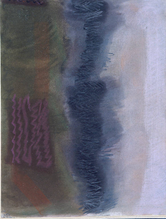 - NOTIZIE STORICO CRITICHE Congdon affianca alla produzione dei dipinti le prime opere a pastello all'inizio degli anni Ottanta. Le prime prove, come in questo caso, risentono ancora di una visione di tipo naturalistico: il paesaggio rurale, che egli osserva della finestra del suo studio alla Cascinazza come tra le montagne di Subiaco, viene restituito in maniera sintetica e allo stesso tempo estremamente narrativa. Compaiono una serie di elementi che rimangono come imprescindibili punti di riferimento: il campo che si incunea verso al linea dell'orizzonte, il filare di alberi che separa la terra dal cielo e il segno scuro del canale sulla destra che fiancheggia il campo, la montagna che chiude la vista della valle dell'Aniene.