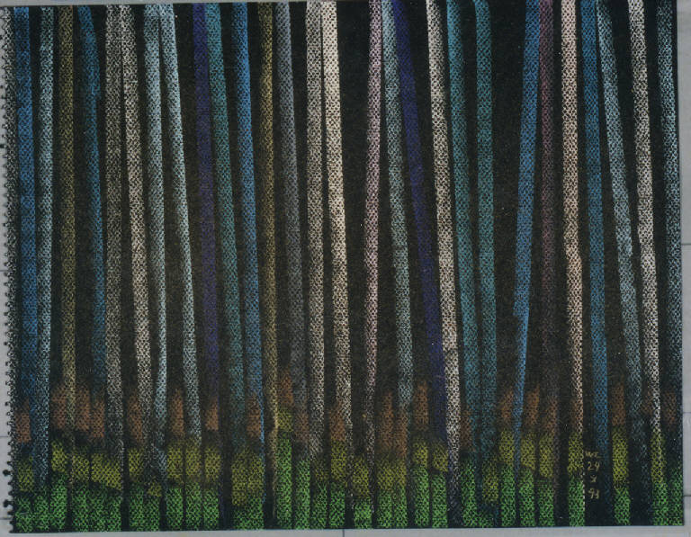 - NOTIZIE STORICO CRITICHE Altra variante del paesaggio è data da una serie di pastelli in cui l'immagine viene descritta mediante una cortina di segni paralleli o quasi, organizzati di volta in volta secondo un'economia differente: ora i segni si fanno più radi e lasciano spazio al fondo e al suo colore, che diventa un elemento più evidentemente costitutivo dell'immagine, ora i segni si fanno più fitti, fino quasi a nascondere il fondo lasciandone intravedere solo alcune linee sottili. C'è anche una differenza ritmica all'interno dell'utilizzo dei segni stessi: una più rigorosa data dall'utilizzo esclusivo di linee parallele, l'altra invece più "melodica" data dall'utilizzo di segni più brevi e ondulati. Di norma in tutti questi casi il paesaggio è dato dal dialogo fra i due elementi costitutivi cielo e terra o dal monologo di uno solo di questi elementi.