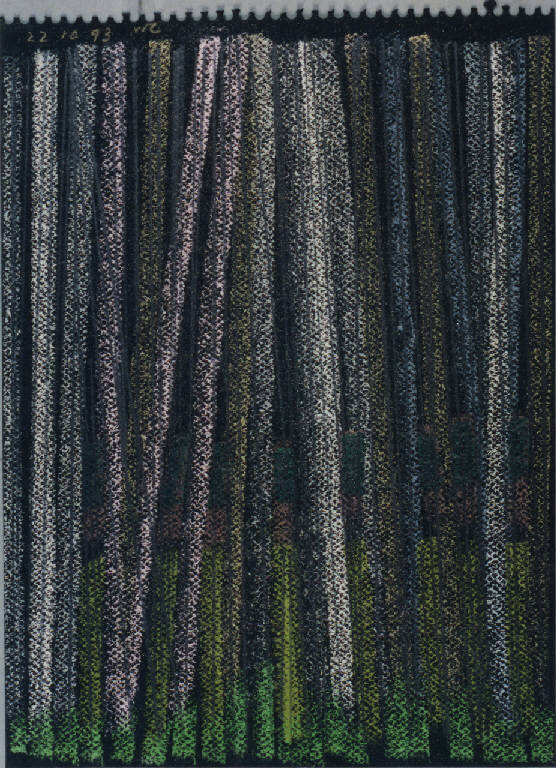 - NOTIZIE STORICO CRITICHE Altra variante del paesaggio è data da una serie di pastelli in cui l'immagine viene descritta mediante una cortina di segni paralleli o quasi, organizzati di volta in volta secondo un'economia differente: ora i segni si fanno più radi e lasciano spazio al fondo e al suo colore, che diventa un elemento più evidentemente costitutivo dell'immagine, ora i segni si fanno più fitti, fino quasi a nascondere il fondo lasciandone intravedere solo alcune linee sottili. C'è anche una differenza ritmica all'interno dell'utilizzo dei segni stessi: una più rigorosa data dall'utilizzo esclusivo di linee parallele, l'altra invece più "melodica" data dall'utilizzo di segni più brevi e ondulati. Di norma in tutti questi casi il paesaggio è dato dal dialogo fra i due elementi costitutivi cielo e terra o dal monologo di uno solo di questi elementi.