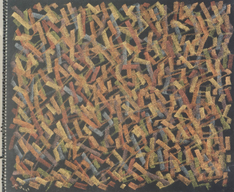 - NOTIZIE STORICO CRITICHE Il brulichio di linee spezzate, intrecciate e sovrapposte, diventa in una parte dei pastelli il motivo dominante che riempie quasi come in una composizione all over la totalità del foglio. Il senso di profondità, che evita la bidimensionalità pura, è dato dall'emergere fra gli spazi del fondo del supporto. A volte predomina lo studio di un elemento del paesaggio, ma più spesso l'intreccio di segni rimane organizzato in masse che rendono più leggibili gli scenari in senso naturalistico: si distinguono, ancora, i campi, il cielo, un albero oppure un cespuglio...