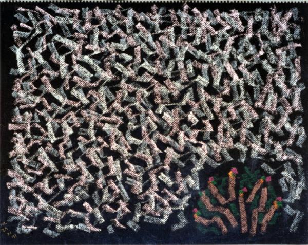 - NOTIZIE STORICO CRITICHE Il brulichio di linee spezzate, intrecciate e sovrapposte, diventa in una parte dei pastelli il motivo dominante che riempie quasi come in una composizione all over la totalità del foglio. Il senso di profondità, che evita la bidimensionalità pura, è dato dall'emergere fra gli spazi del fondo del supporto. A volte predomina lo studio di un elemento del paesaggio, ma più spesso l'intreccio di segni rimane organizzato in masse che rendono più leggibili gli scenari in senso naturalistico: si distinguono, ancora, i campi, il cielo, un albero oppure un cespuglio...