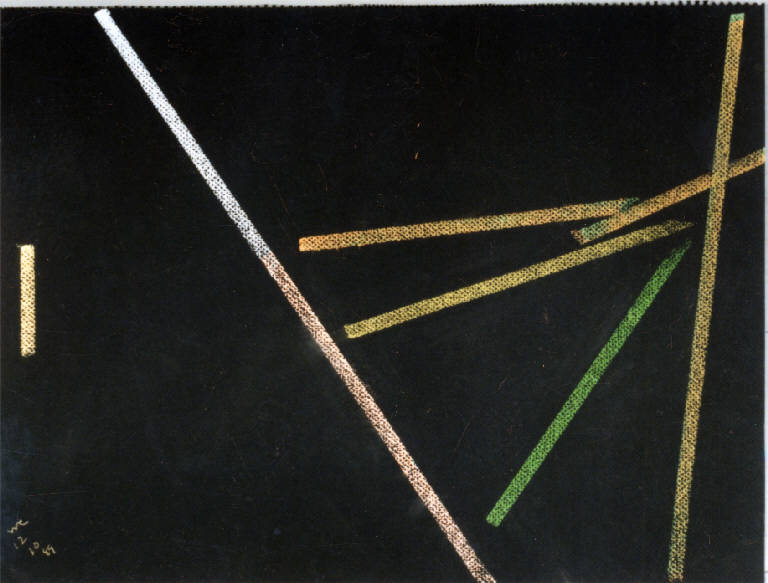 - NOTIZIE STORICO CRITICHE L'osservazione inesausta e quotidiana del paesaggio antistante lo studio trova nei pastelli, rispetto alla pittura, una via rappresentativa del tutto particolare. Gli elementi del paesaggio vengono infatti ridotti all'estremo fino a portare la composizione ad un'apparente astrazione. Tuttavia è possibile riconoscere quegli stessi elementi che caratterizzano i paesaggio della Bassa milanese anche più descrittivi: cielo, terra, canale e filare di alberi. Questi elementi chiave vengono riassunti in un solo segno che diventa la traccia luminosa di ciò che rappresenta. Il resto della composizione, il senso spaziale e atmosferico della stessa, è affidato al colore del supporto stesso che viene ravvivato dai segni ortogonali, curvi o obliqui che lo percorrono.