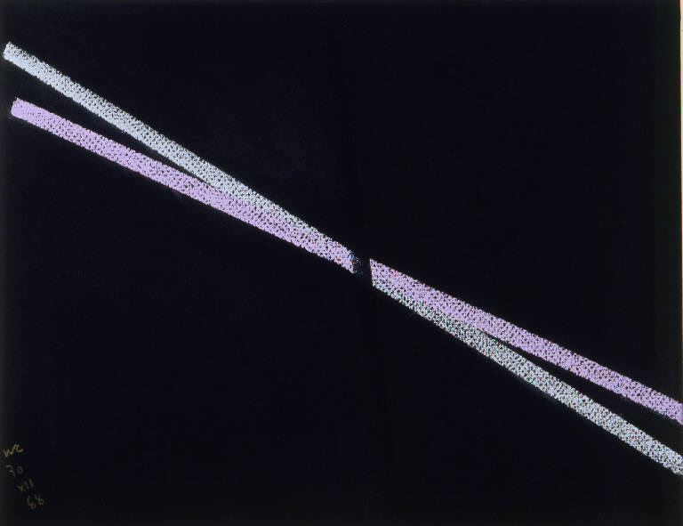 - NOTIZIE STORICO CRITICHE L'osservazione inesausta e quotidiana del paesaggio antistante lo studio trova nei pastelli, rispetto alla pittura, una via rappresentativa del tutto particolare. Gli elementi del paesaggio vengono infatti ridotti all'estremo fino a portare la composizione ad un'apparente astrazione. Tuttavia è possibile riconoscere quegli stessi elementi che caratterizzano i paesaggio della Bassa milanese anche più descrittivi: cielo, terra, canale e filare di alberi. Questi elementi chiave vengono riassunti in un solo segno che diventa la traccia luminosa di ciò che rappresenta. Il resto della composizione, il senso spaziale e atmosferico della stessa, è affidato al colore del supporto stesso che viene ravvivato dai segni ortogonali, curvi o obliqui che lo percorrono.