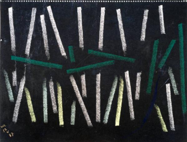 - NOTIZIE STORICO CRITICHE Altra variante del paesaggio è data da una serie di pastelli in cui l'immagine viene descritta mediante una cortina di segni paralleli o quasi, organizzati di volta in volta secondo un'economia differente: ora i segni si fanno più radi e lasciano spazio al fondo e al suo colore, che diventa un elemento più evidentemente costitutivo dell'immagine, ora i segni si fanno più fitti, fino quasi a nascondere il fondo lasciandone intravedere solo alcune linee sottili. C'è anche una differenza ritmica all'interno dell'utilizzo dei segni stessi: una più rigorosa data dall'utilizzo esclusivo di linee parallele, l'altra invece più "melodica" data dall'utilizzo di segni più brevi e ondulati. Di norma in tutti questi casi il paesaggio è dato dal dialogo fra i due elementi costitutivi cielo e terra o dal monologo di uno solo di questi elementi.