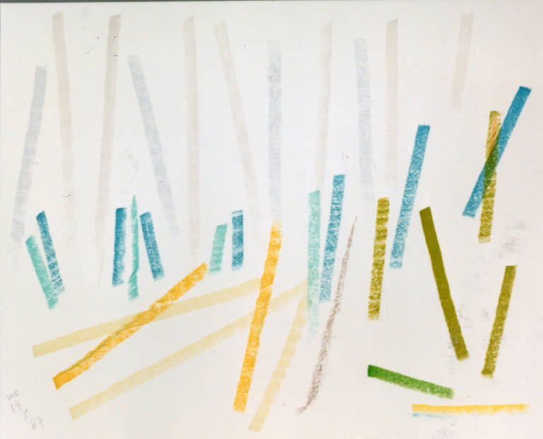 - NOTIZIE STORICO CRITICHE Altra variante del paesaggio è data da una serie di pastelli in cui l'immagine viene descritta mediante una cortina di segni paralleli o quasi, organizzati di volta in volta secondo un'economia differente: ora i segni si fanno più radi e lasciano spazio al fondo e al suo colore, che diventa un elemento più evidentemente costitutivo dell'immagine, ora i segni si fanno più fitti, fino quasi a nascondere il fondo lasciandone intravedere solo alcune linee sottili. C'è anche una differenza ritmica all'interno dell'utilizzo dei segni stessi: una più rigorosa data dall'utilizzo esclusivo di linee parallele, l'altra invece più "melodica" data dall'utilizzo di segni più brevi e ondulati. Di norma in tutti questi casi il paesaggio è dato dal dialogo fra i due elementi costitutivi cielo e terra o dal monologo di uno solo di questi elementi.