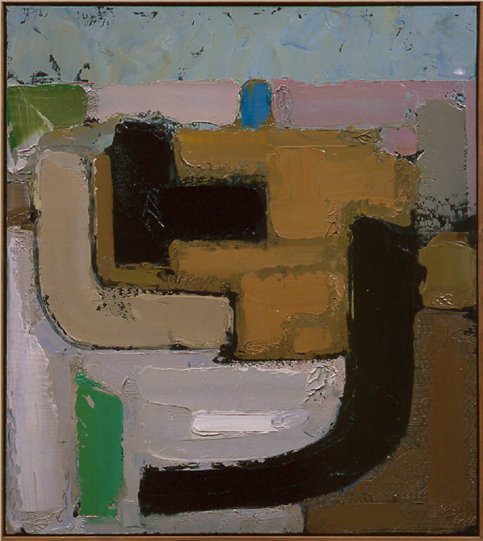 - NOTIZIE STORICO CRITICHE Anche in quest'opera Congdon porta avanti una strategia compositiva che parte da una scomposizione del dato reale per poi ricombinarlo liberamente e in maniera aprospettica. Gli unici elementi che mantengono un appiglio reale al paesaggio visibile dalla finestra dello studio dell'artista sono la line di orizzonte molto alta che separa il cielo dal patchwork dei campi sottostanti e il segno nero ricurvo nell'angolo destro che descrive sinteticamente il canale che curva proprio sotto la finestra dello studio.