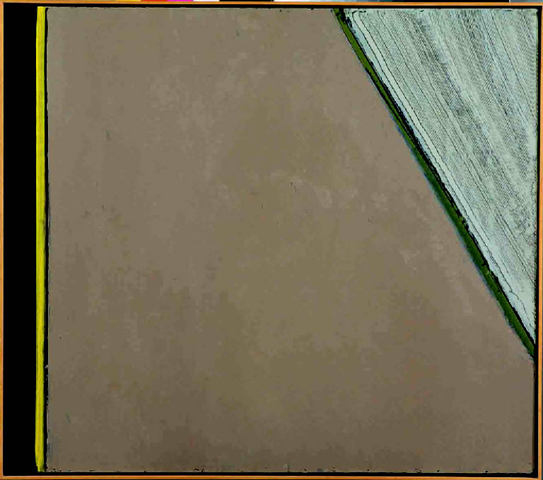 - NOTIZIE STORICO CRITICHE Nei primi mesi del 1994, Congdon si cimenta con le grandi stesure cromatiche dei campi in alcuni dipinti che sembrano riproporre il duplice binario della sua pittura. Sul binario dell'astrazione "Color-field "si colloca la serie "Campo sole" con le sue solenni, mute campiture di colore e le partiture rigorosamente rettilinee. La deriva verso l'astrazione geometrica sembra qui essere proprio imposta dalle stesse difficoltà fisiche dell'artista, ora compensate con l'uso del righello (evidente nelle due strisce sottili, gialla e verde, che delimitano la grande area centrale) e con una economia estrema dei segni (due soli campi di colore cui si affianca, sulla sinistra, la banda nera della preparazione). D'altra parte, come nei pastelli coevi, l'artista ravviva i toni piuttosto spenti dei due dipinti sfruttando la capacità di irradiazione luminosa del colore concentrato in puri tratti lineari.