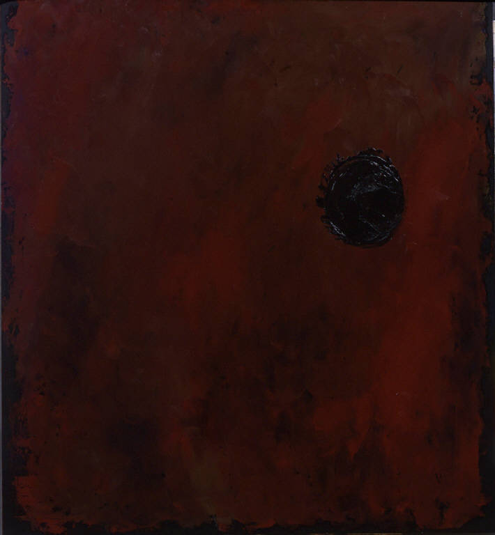 - NOTIZIE STORICO CRITICHE Gli impasti e la mescolanza dei colori possono avere esiti espressivi ben diversi da "Nebbia Viola", come dimostra "Baghdad, 1", eseguito pochi giorni dopo: sul pannello nero viene steso un colore rossastro variamente modulato dal trasparire del fondo. Ne deriva un'atmosfera davvero infernale, suggellata dal grande disco nero, dall'impasto molto denso, che campeggia sinistro e allucinato. Del resto, l'acuta sensibilità ai drammi della storia - in questo caso lo scoppio della prima Guerra del Golfo - è un dato costante dell'arte congdoniana che neppure in questa estrema e serena stagione viene smentito.