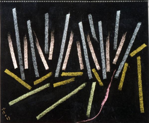 - NOTIZIE STORICO CRITICHE Altra variante del paesaggio è data da una serie di pastelli in cui l'immagine viene descritta mediante una cortina di segni paralleli o quasi, organizzati di volta in volta secondo un'economia differente: ora i segni si fanno più radi e lasciano spazio al fondo e al suo colore, che diventa un elemento più evidentemente costitutivo dell'immagine, ora i segni si fanno più fitti, fino quasi a nascondere il fondo lasciandone intravedere solo alcune linee sottili. C'è anche una differenza ritmica all'interno dell'utilizzo dei segni stessi: una più rigorosa data dall'utilizzo esclusivo di linee parallele, l'altra invece più "melodica" data dall'utilizzo di segni più brevi e ondulati. Di norma in tutti questi casi il paesaggio è dato dal dialogo fra i due elementi costitutivi cielo e terra o dal monologo di uno solo di questi elementi.