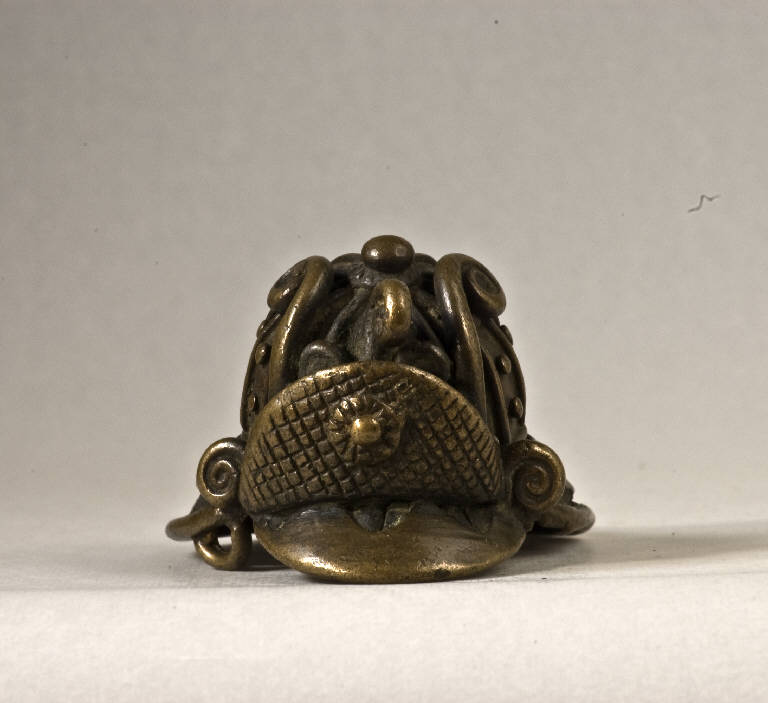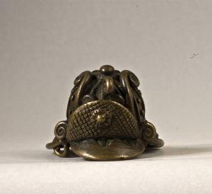 Netsuke in bronzo raffigurante un elmo (kabuto). Poiché il suo peso non è trascurabile, è molto probabile che non potesse essere utilizzato per un inro, ma per una scatola da tabacco di tipo tonkotsu.