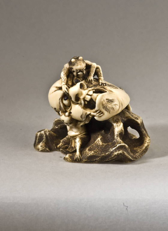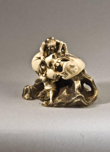 Netsuke-okimono raffigurante tre oni su una roccia, impegnati a trasportare una maschera di uomo con denti prominenti, occhi strabuzzati, baffi e pizzetto. I due ideogrammi della firma sono racchiusi all'interno di un sigillo a forma di caraffa, mentre i due fori dell'himotoshi sono raccolti entro un cartiglio a zucca a due corpi ubicato sotto la base.