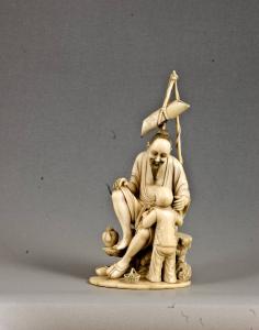 La statuetta raffigura un uomo seduto su una roccia, vestito di un ampio abito allacciato in vita e aperto sul davanti a mostrare il petto; tiene la mano destra posata sul ginocchio sollevato, mentre con quella sinistra accarezza il capo del bambino che gli sta vicino; alla sua sinistra, posata su uno spuntone della roccia, si vede una teiera, mentre ai suoi piedi, uno dei quali scalzo, giace un piccolo cestino con manico in vimini intrecciato contenente alcuni pesci; oltre le spalle dell'uomo, la canna da pesca alla cui sommità è legato con un laccio il suo cappello. Si tratta senza dubbio di un personaggio cinese riconoscibile, oltre che per il particolare abbigliamento, anche per la tipica acconciatura con i capelli legati in una crocchia sul capo, e per il lungo pizzetto con baffi.
