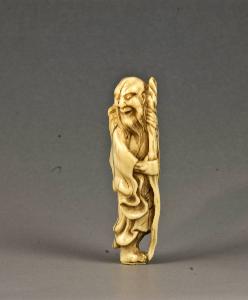 Netsuke raffigurante un immortale taoista (sennin) con lunga barba fluente ed espressione sorridente; vestito di un ampio abito sul quale si sovrappongono foglie di artemisia intrecciate come impermeabile, con entrambe le mani tiene un bastone che gli fa da sostegno; alla cintura porta appesa una fiasca da pellegrino a forma di zucca. I due fori dell'himotoshi si trovano sul retro all'altezza del bacino, quello di dimensioni maggiori più in basso rispetto a quello più piccolo.