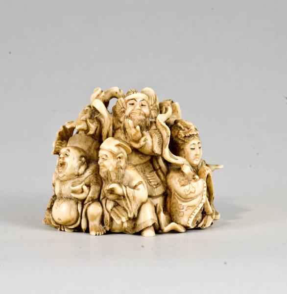 Okimono raffigurante i Sette Dei della Fortuna (Shichifukujin), raggruppati in cerchio l'uno di fianco all'altro.