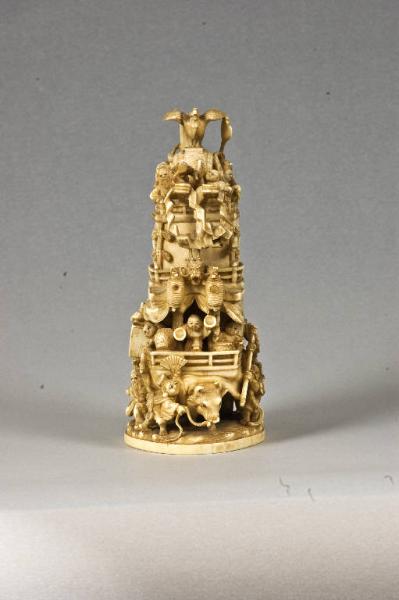 Okimono raffigurante i Sette Dei della Fortuna (Shichifukujin) sulla Barca dei Tesori (takarabune). La mitica imbarcazione, costituita da più piani, è sistemata sulle possenti spalle di un solo bue, intorno al quale si dispongono cinque delle sette divinità e un "bambino cinese" (karako); al primo piano, la parata mostra sul davanti tre karako impegnati a suonare tamburi e piatti, mentre sul retro è raffigurato un gong buddhista (tsuridaiko) protetto da una cortina di tessuto; il secondo piano è occupato dalle due rimanenti divinità accompagnate da due karako che suonano; in ultimo, sulla cima si erge un gallo (niwatori) posato su un tamburo da guerra (kankodori). La base è decorata con uno scorcio di paesaggio con padiglione, alberi e fiume.