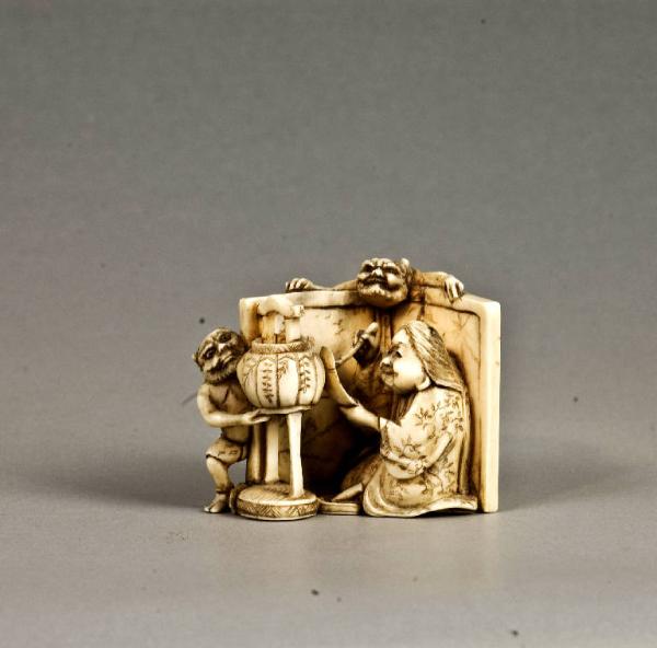 Protetta da un paravento a due ante, sulla parte interna di una delle quali è appena abbozzato uno scorcio di paesaggio mentre sull'altra si vedono sottili fusti di bambù, sta seduta Okame, intenta a scrivere con un pennello su un foglio; nelle sue vicinanze è sistemato un piedistallo a due gambe sul quale sta posato un vaso ornato con rami di glicine. La osservano due demoni (oni), uno dei quali si affaccia dal lato sinistro del paravento, l'altro dal centro in alto, sostenuto da uno sgabello. Il retro delle due ante dei paraventi è ornato da quattro cartigli rettangolari e uno a forma di ventaglio, all'interno dei quali sono iscritte poesie.