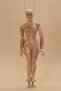 Testa, corpo e braccia in cartapesta, mani in legno di tiglio scolpito con dita unite, braccia e mani snodate collegate con incastri ed elastico. Presenza di un anello (forchinella) nelle labbra.