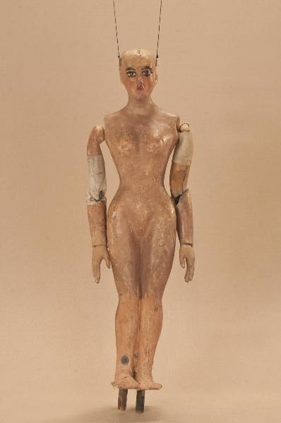 Testa, corpo e braccia in cartapesta, mani in legno di tiglio scolpito con dita unite, braccia e mani snodate collegate con incastri ed elastico. Presenza di un anello (forchinella) nelle labbra.