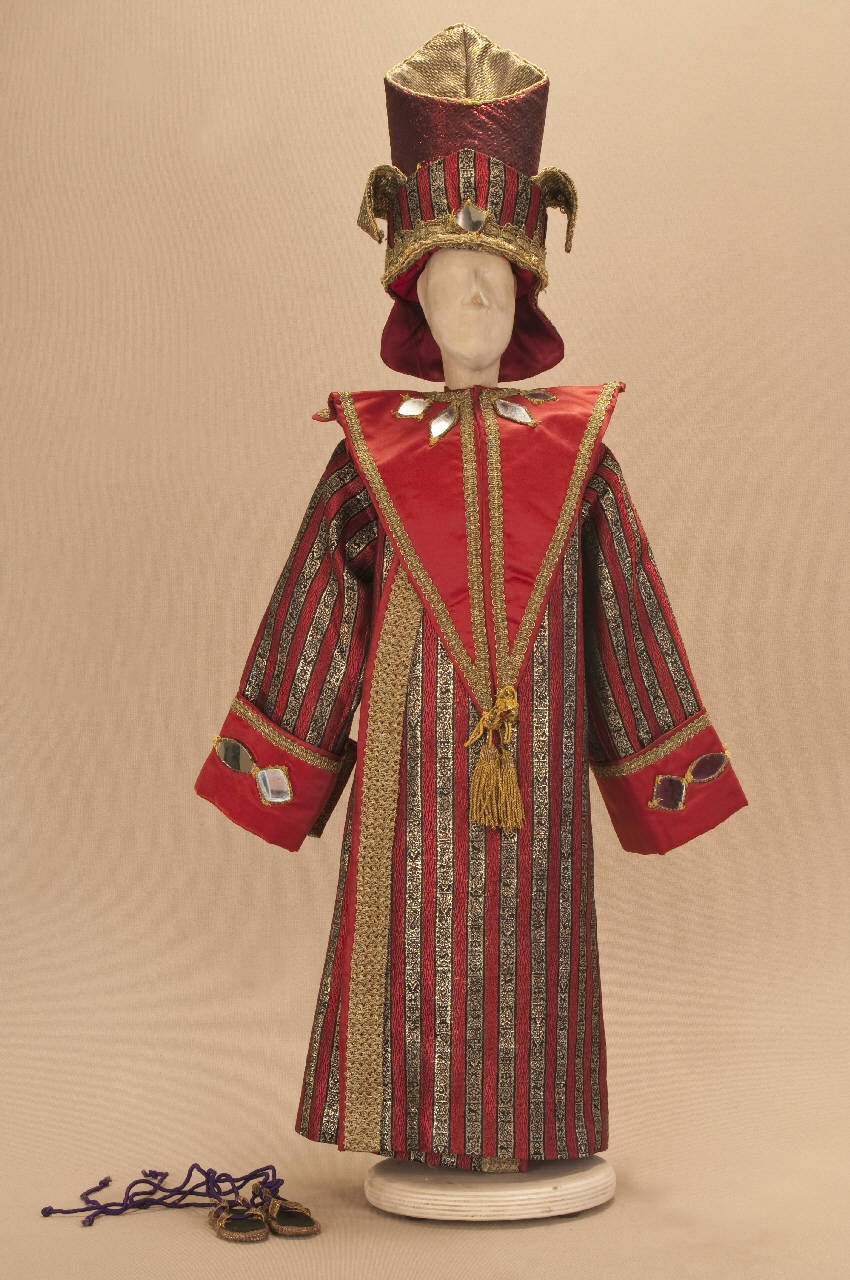 - NOTIZIE STORICO CRITICHE Parti del costume (cappello, collo e veste) sono state realizzate nel 1985 in sostituzione di quelle originarie, anche utilizzando materiali antichi come gli specchietti decorativi. Nel 1906 la Compagnia Carlo Colla e Figli approda per la prima volta al Teatro Gerolamo di Milano dove aveva già trionfato da diversi anni la formazione di Antonio Colla che all¿inizio del secolo aveva preso il nome di Compagnia Colla -Croce. Milano viveva il grande evento della Expo Internazionale. I Colla acquistano presso il Padiglione del Giappone tessuti, teste in lacca, marionette e armature da Samurai, materiali che vengono immediatamente impiegati per un nuovo allestimento: la fiaba giapponese, "La Geisha dei Topi" Tutti i personaggi hanno testa di topo e questo procurerà alcune proteste delle spettatrici in stato interessante che si dichiarano impressionate dai personaggi che agiscono sul palcoscenico. Dopo qualche anno, lo spettacolo sarà trasformato da Carlo II Colla in "La Sposa del Sole"; i topi sono scomparsi così come il viaggio verso il sole in bicicletta e in automobile viene sostituito da un viaggio in aeroplano. Lo spettacolo subirà nuovi mutamenti ad opera di Maria Vanni Colla, figlia primogenita di Carlo II Colla, che sostituirà il personaggio della Nube con quello del Nembo. Lo spettacolo verrà rappresentato per l¿ultima volta al Teatro Gerolamo nel 1956. Nel 1973, lo spettacolo viene ripreso dalla televisione.\nNel 1985 viene presentato al Teatro dell¿Arte di Milano, portato in seguito a Berlino per il Festival "Horizonte" e ripreso al Festival di Spoleto nel 2004 su richiesta di Giancarlo Menotti per i festeggiamenti del suo compleanno. Nel 2009 viene presentato nell¿ambito di MITO al Teatro Carcano di Milano.