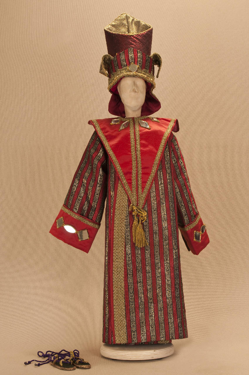 - NOTIZIE STORICO CRITICHE Parti del costume (cappello, collo e veste) sono state realizzate nel 1985 in sostituzione di quelle originarie, anche utilizzando materiali antichi come gli specchietti decorativi. Nel 1906 la Compagnia Carlo Colla e Figli approda per la prima volta al Teatro Gerolamo di Milano dove aveva già trionfato da diversi anni la formazione di Antonio Colla che all¿inizio del secolo aveva preso il nome di Compagnia Colla -Croce. Milano viveva il grande evento della Expo Internazionale. I Colla acquistano presso il Padiglione del Giappone tessuti, teste in lacca, marionette e armature da Samurai, materiali che vengono immediatamente impiegati per un nuovo allestimento: la fiaba giapponese, "La Geisha dei Topi" Tutti i personaggi hanno testa di topo e questo procurerà alcune proteste delle spettatrici in stato interessante che si dichiarano impressionate dai personaggi che agiscono sul palcoscenico. Dopo qualche anno, lo spettacolo sarà trasformato da Carlo II Colla in "La Sposa del Sole"; i topi sono scomparsi così come il viaggio verso il sole in bicicletta e in automobile viene sostituito da un viaggio in aeroplano. Lo spettacolo subirà nuovi mutamenti ad opera di Maria Vanni Colla, figlia primogenita di Carlo II Colla, che sostituirà il personaggio della Nube con quello del Nembo. Lo spettacolo verrà rappresentato per l¿ultima volta al Teatro Gerolamo nel 1956. Nel 1973, lo spettacolo viene ripreso dalla televisione.\nNel 1985 viene presentato al Teatro dell¿Arte di Milano, portato in seguito a Berlino per il Festival "Horizonte" e ripreso al Festival di Spoleto nel 2004 su richiesta di Giancarlo Menotti per i festeggiamenti del suo compleanno. Nel 2009 viene presentato nell¿ambito di MITO al Teatro Carcano di Milano.