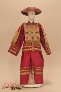 Costume fantastico composto da pantaloni, giacca, collo, corazzina e sandali. Si completa con un cappello che ha il codice C 07878.