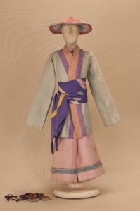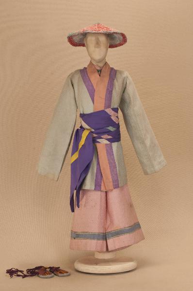 Costume da popolano giapponese composto da giacca, pantaloni, corpino, collo, fascia e sandali. Si completa con un cappello che ha il codice C 07882.