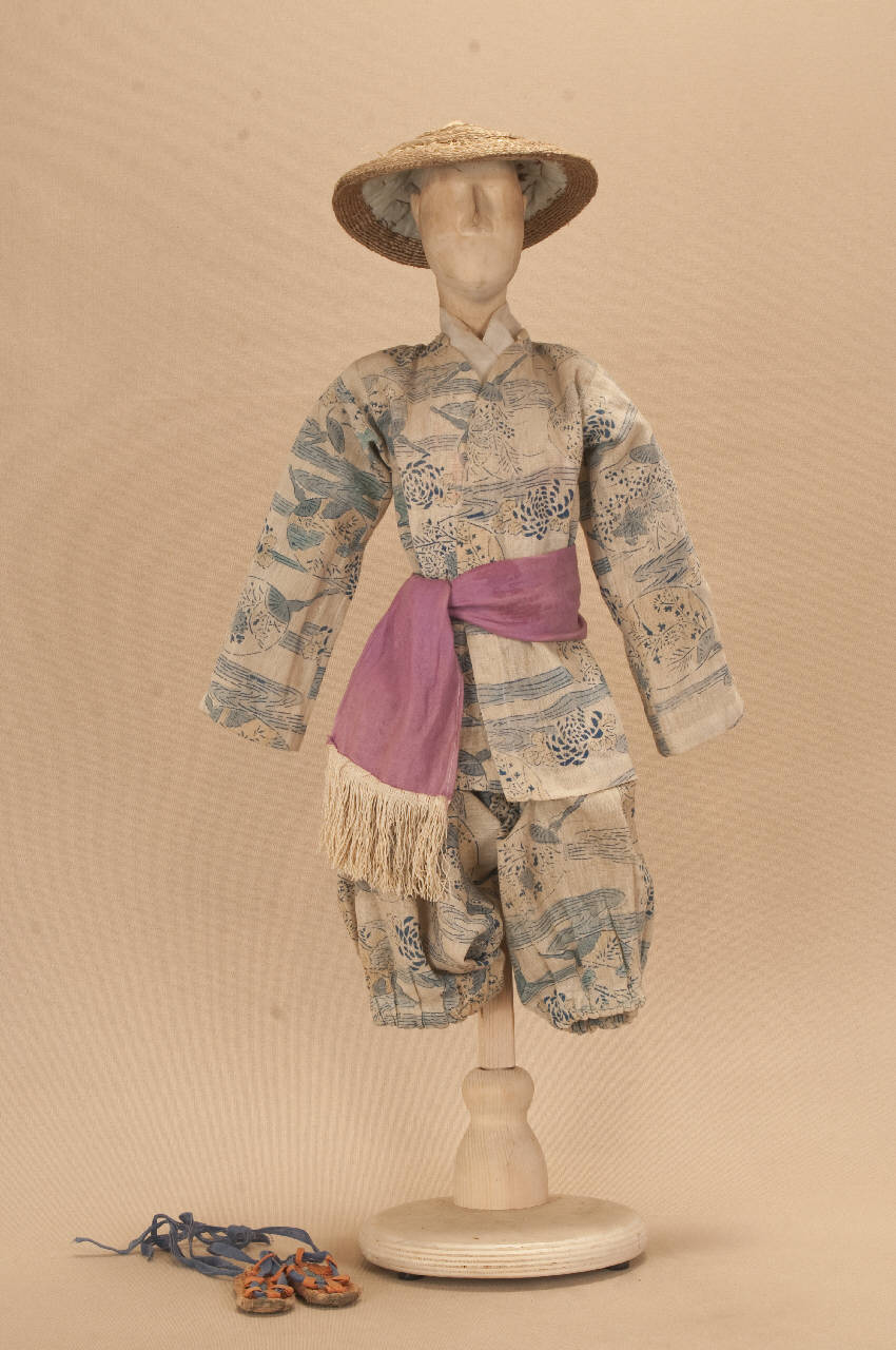 Costume da popolano giapponese composto da giacca, pantaloni, fascia, collo e sandali. Si completa con un cappello che ha il codice C 07871.