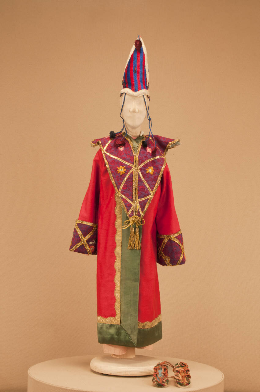 - NOTIZIE STORICO CRITICHE Veste, collare e cappello sono stati rifatti nel 1985 sul modello e in sostituzione di quelli originali ideati da Carlo II Colla e Rosina Colla per la prima messa in scena dello spettacolo. Nel 1906 la Compagnia Carlo Colla e Figli approda per la prima volta al Teatro Gerolamo di Milano dove aveva già trionfato da diversi anni la formazione di Antonio Colla che all¿inizio del secolo aveva preso il nome di Compagnia Colla -Croce. Milano viveva il grande evento della Expo Internazionale. I Colla acquistano presso il Padiglione del Giappone tessuti, teste in lacca, marionette e armature da Samurai, materiali che vengono immediatamente impiegati per un nuovo allestimento: la fiaba giapponese, "La Geisha dei Topi" Tutti i personaggi hanno testa di topo e questo procurerà alcune proteste delle spettatrici in stato interessante che si dichiarano impressionate dai personaggi che agiscono sul palcoscenico. Dopo qualche anno, lo spettacolo sarà trasformato da Carlo II Colla in "La Sposa del Sole"; i topi sono scomparsi così come il viaggio verso il sole in bicicletta e in automobile viene sostituito da un viaggio in aeroplano. Lo spettacolo subirà nuovi mutamenti ad opera di Maria Vanni Colla, figlia primogenita di Carlo II Colla, che sostituirà il personaggio della Nube con quello del Nembo. Lo spettacolo verrà rappresentato per l¿ultima volta al Teatro Gerolamo nel 1956. Nel 1973, lo spettacolo viene ripreso dalla televisione.\nNel 1985 viene presentato al Teatro dell¿Arte di Milano, portato in seguito a Berlino per il Festival "Horizonte" e ripreso al Festival di Spoleto nel 2004 su richiesta di Giancarlo Menotti per i festeggiamenti del suo compleanno. Nel 2009 viene presentato nell¿ambito di MITO al Teatro Carcano di Milano.
