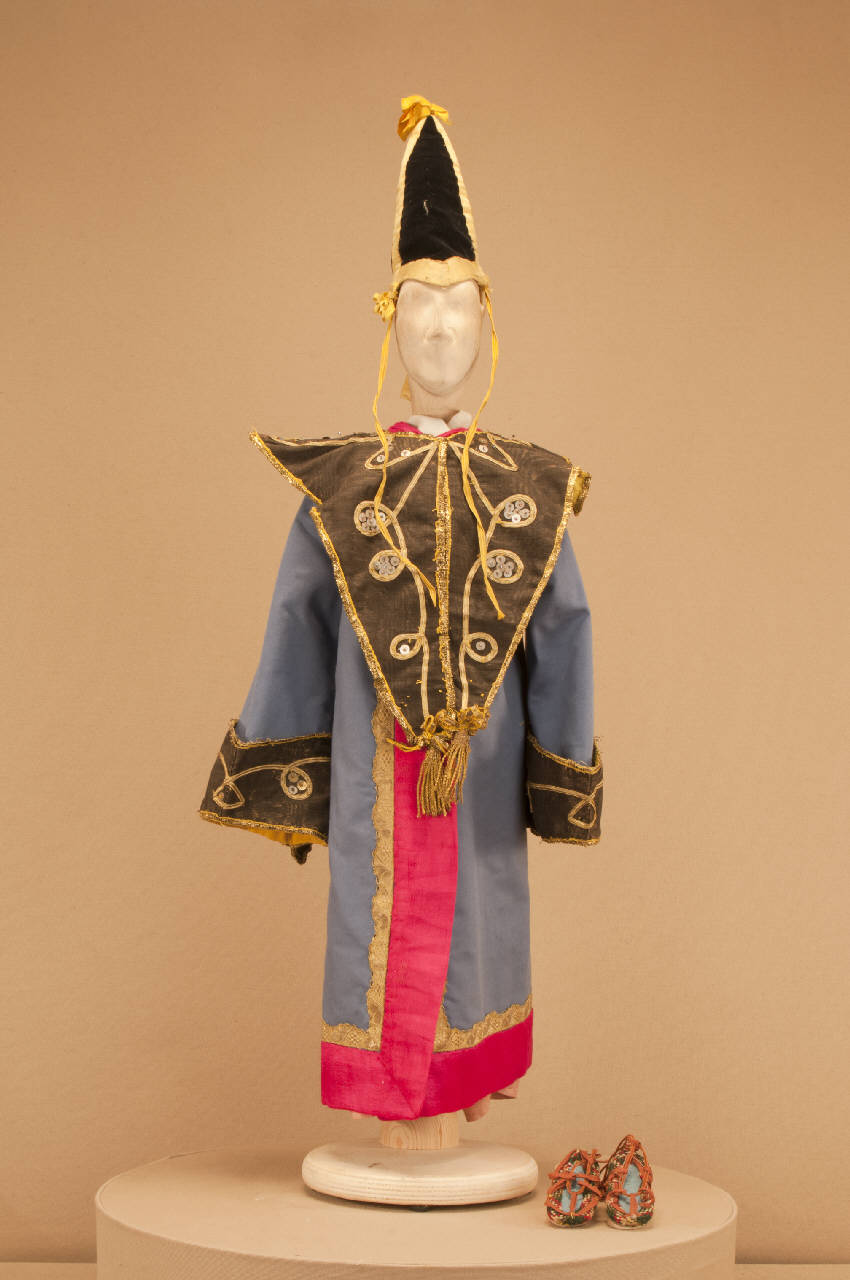 - NOTIZIE STORICO CRITICHE Veste, collare e cappello sono stati rifatti nel 1985 sul modello e in sostituzione di quelli originali ideati da Carlo II Colla e Rosina Colla per la prima messa in scena dello spettacolo. Nel 1906 la Compagnia Carlo Colla e Figli approda per la prima volta al Teatro Gerolamo di Milano dove aveva già trionfato da diversi anni la formazione di Antonio Colla che all¿inizio del secolo aveva preso il nome di Compagnia Colla -Croce. Milano viveva il grande evento della Expo Internazionale. I Colla acquistano presso il Padiglione del Giappone tessuti, teste in lacca, marionette e armature da Samurai, materiali che vengono immediatamente impiegati per un nuovo allestimento: la fiaba giapponese, "La Geisha dei Topi" Tutti i personaggi hanno testa di topo e questo procurerà alcune proteste delle spettatrici in stato interessante che si dichiarano impressionate dai personaggi che agiscono sul palcoscenico. Dopo qualche anno, lo spettacolo sarà trasformato da Carlo II Colla in "La Sposa del Sole"; i topi sono scomparsi così come il viaggio verso il sole in bicicletta e in automobile viene sostituito da un viaggio in aeroplano. Lo spettacolo subirà nuovi mutamenti ad opera di Maria Vanni Colla, figlia primogenita di Carlo II Colla, che sostituirà il personaggio della Nube con quello del Nembo. Lo spettacolo verrà rappresentato per l¿ultima volta al Teatro Gerolamo nel 1956. Nel 1973, lo spettacolo viene ripreso dalla televisione.\nNel 1985 viene presentato al Teatro dell¿Arte di Milano, portato in seguito a Berlino per il Festival "Horizonte" e ripreso al Festival di Spoleto nel 2004 su richiesta di Giancarlo Menotti per i festeggiamenti del suo compleanno. Nel 2009 viene presentato nell¿ambito di MITO al Teatro Carcano di Milano.